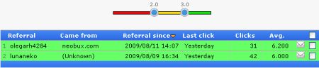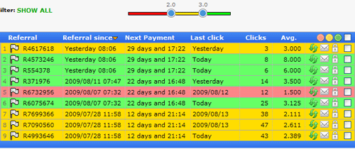 Вы можете сразу раделить рефералов по цветам как у меня. Цвет реферала определяется по уровню AVG. AVG -это средний показатель активности реферала. У меня красные - это с AVG до 2-х, такие рефералы практически себя не окупают и их надо заменять, желтые с AVG от 2-х до 3-х, средний показатель, рефералы себя окупают за 2-3 недели и приносят вам небольшой доход, 10-20 центов в месяц и, наконец, зеленые, окупают себя в первые 1-2 недели и приносят доход 30-50 центов.