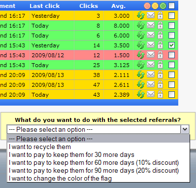 Желтых и зеленых рефералов нужно продлевать, а красных заменять. Для этого вам нужно галочкой отметить реферала и выбрать что вы хотите с ним сделать.